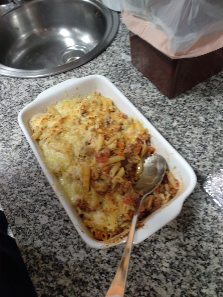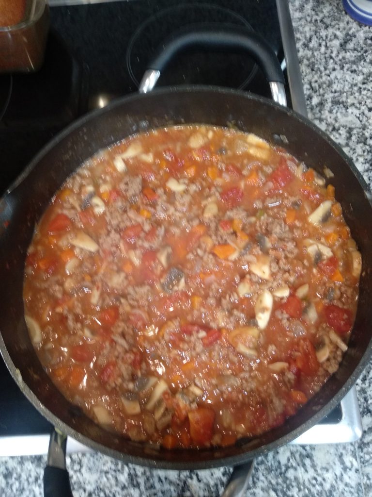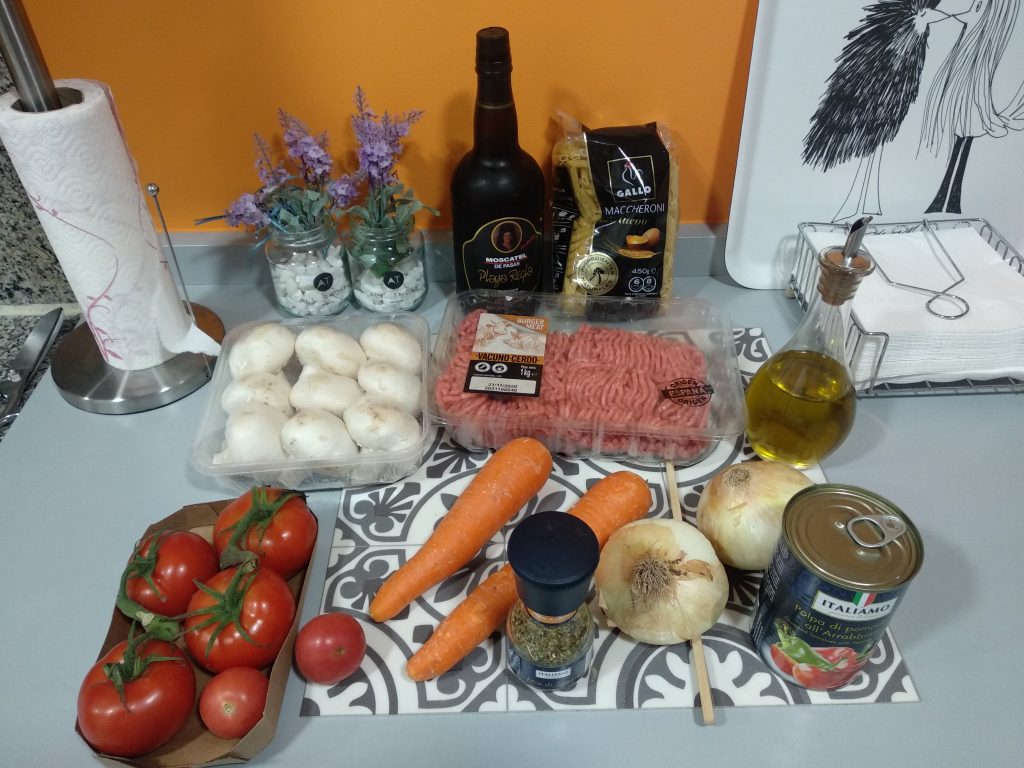 Macarrones con carne picada (ragut como dicen los italianos), zanahoria y champiñones