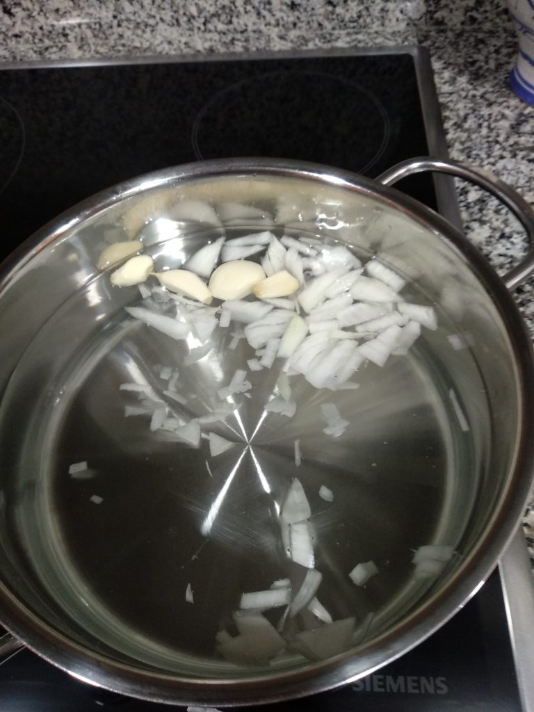 - Poner ajo y cebolla unos dos minutos en el agua hirviendo