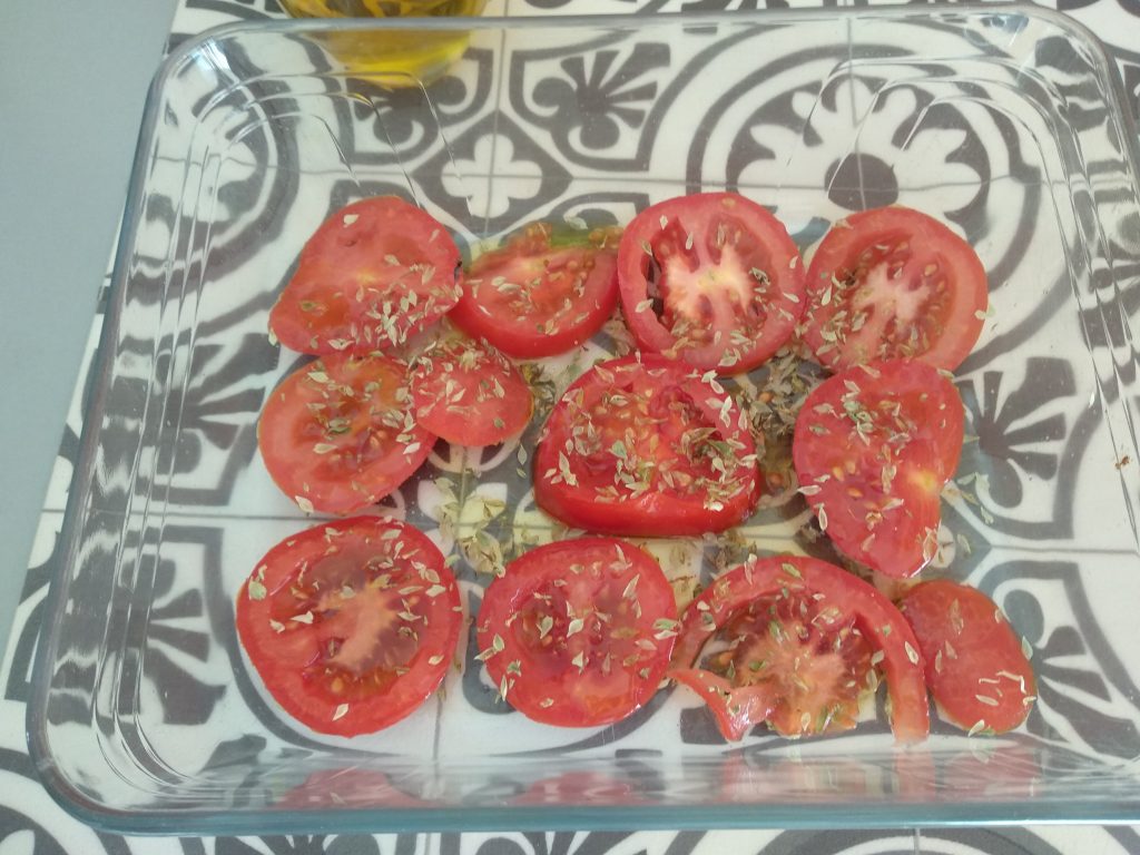 - Lavar, pelar y cortar los tomates a rodajas y ponerlos en una bandeja. Añadir encima sal, pimienta, azucar, orégano y aceite. Dejar en el horno 10 minutos.