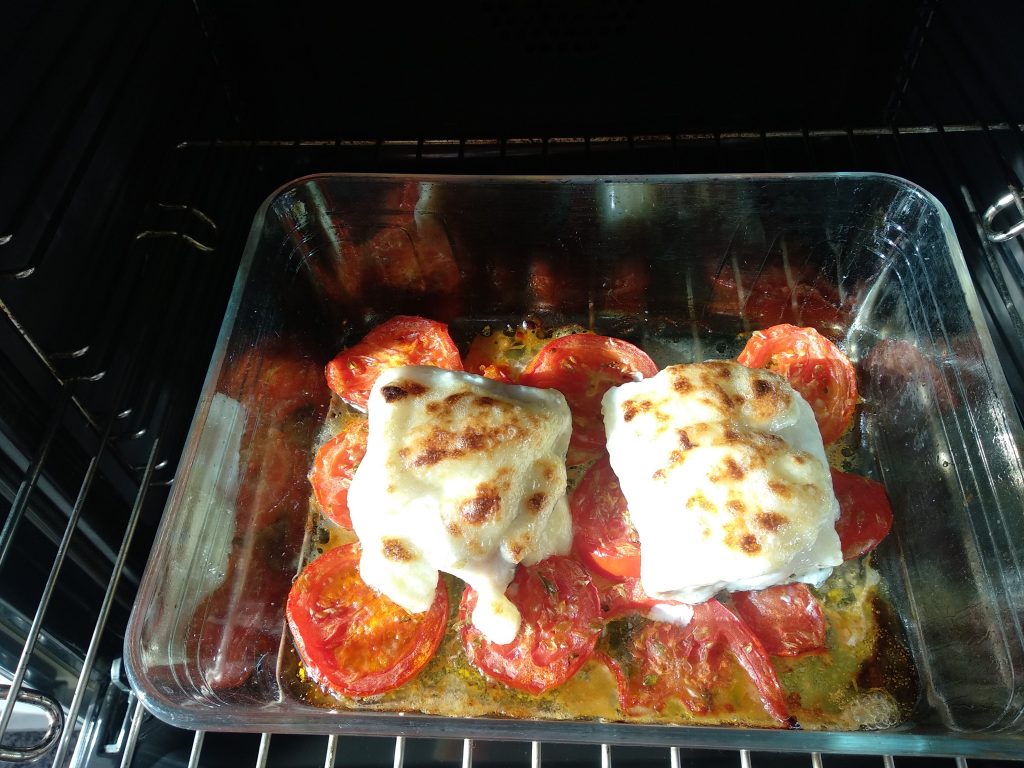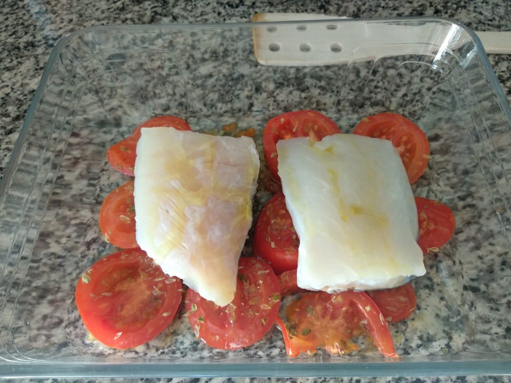 - Poner los lomos encima del tomate con la piel hacia abajo, regarlos con aceite, y dejarlo 12 minutos más