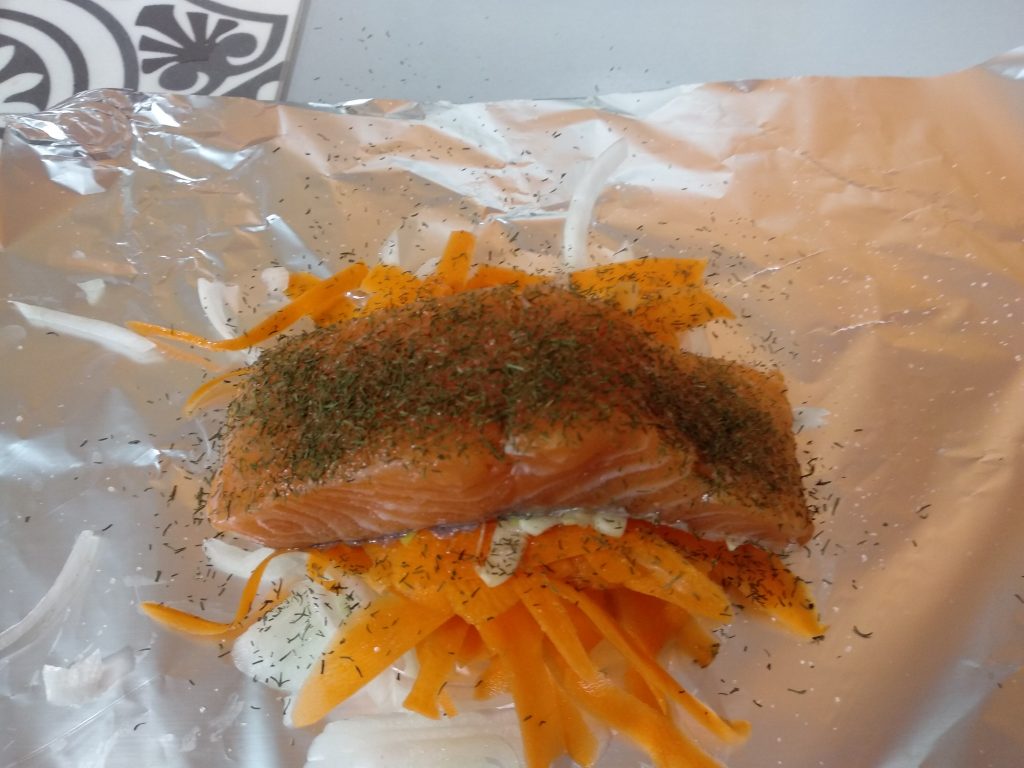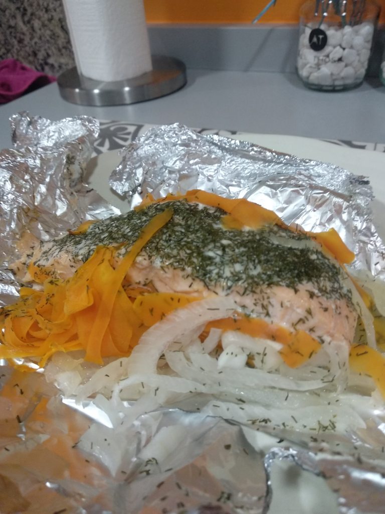 Para la papillote uso lomos de salmón frescos o bien congelados. Los aderezo y envuelvo en papel ‘de plata’ o Albal. Y al horno.