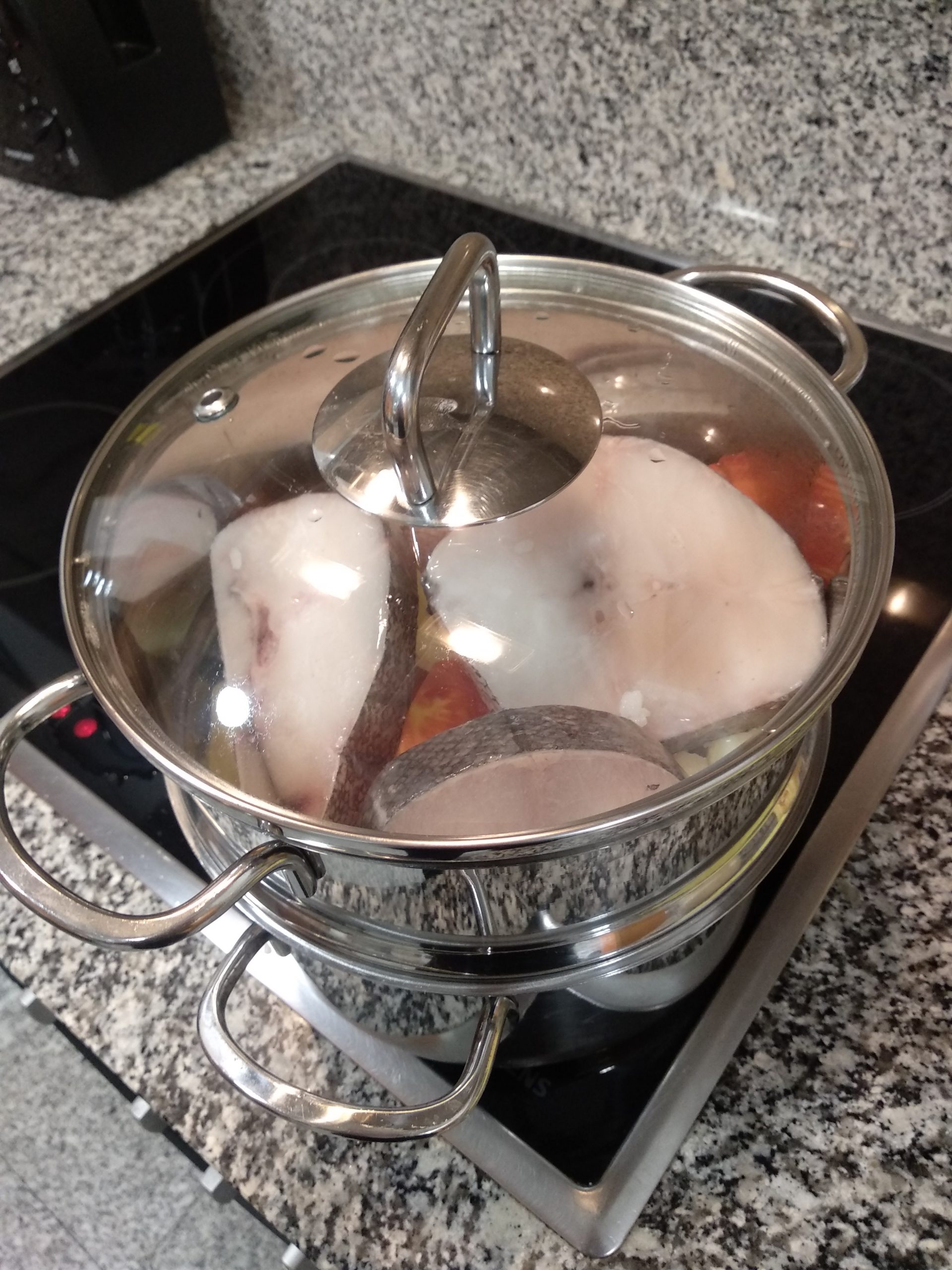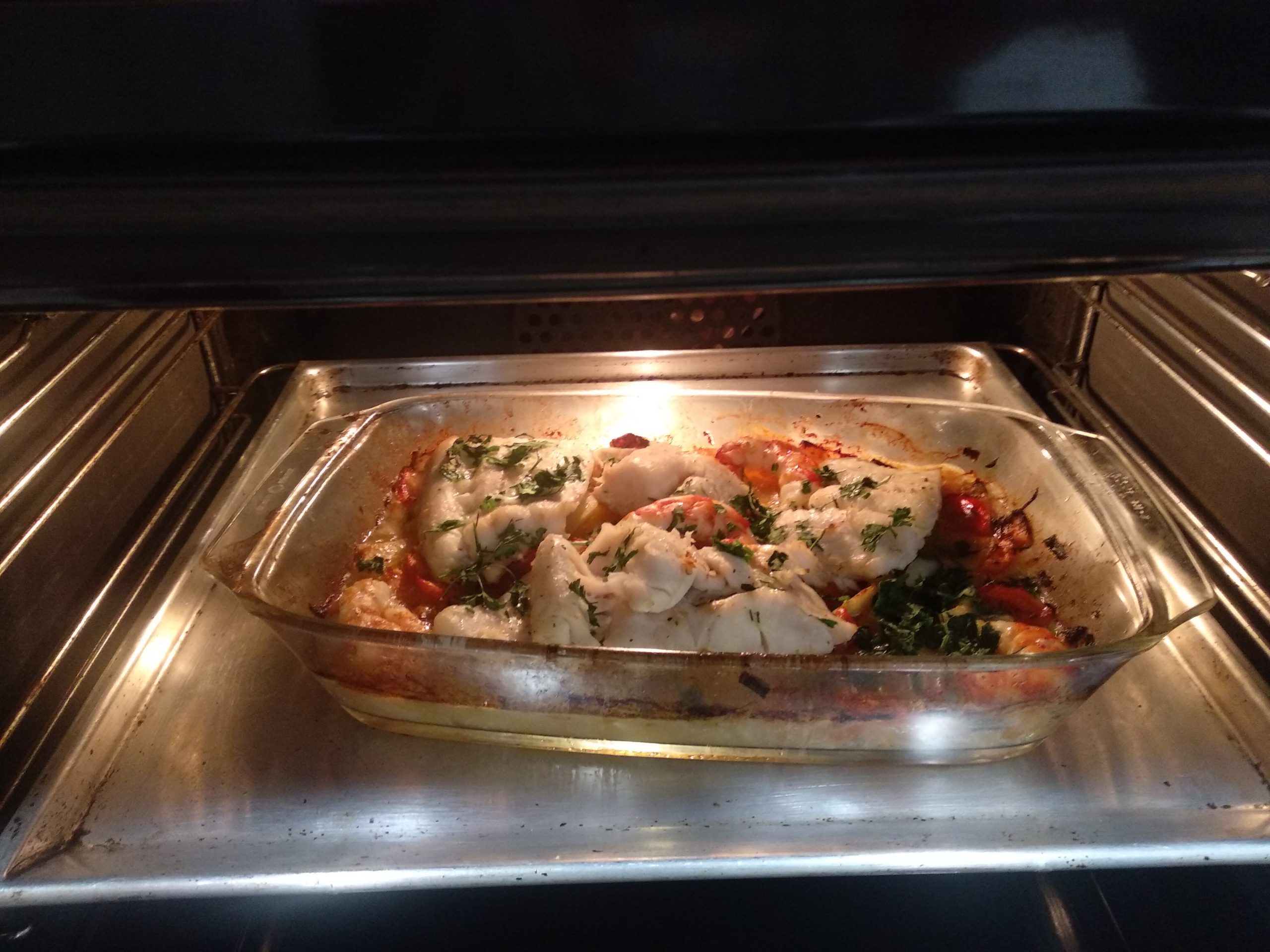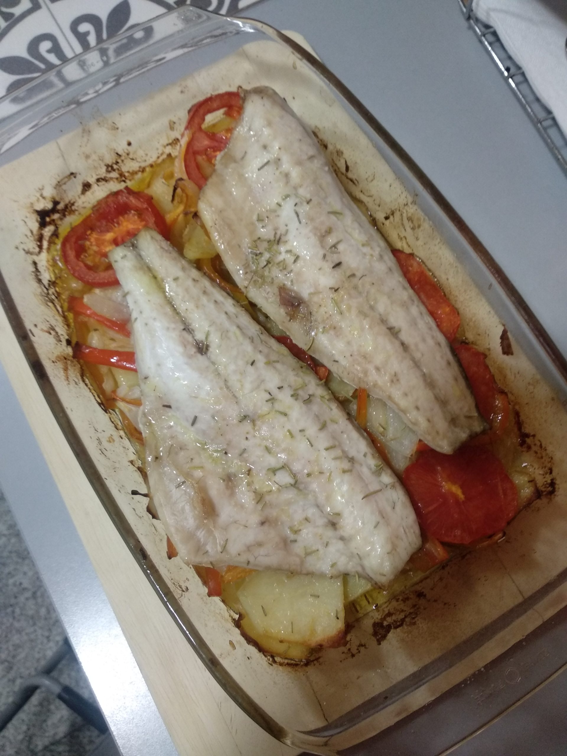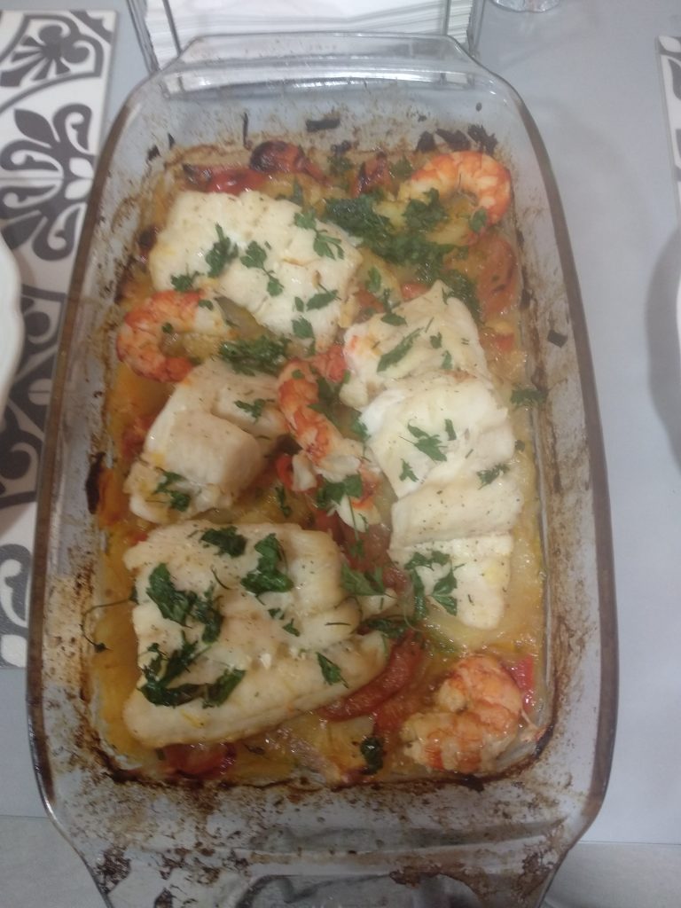 He hecho una mezcla de mi receta de lubina al horno y esta receta de internet: https://irecetasfaciles.com/merluza-horno-gambas-patatas/