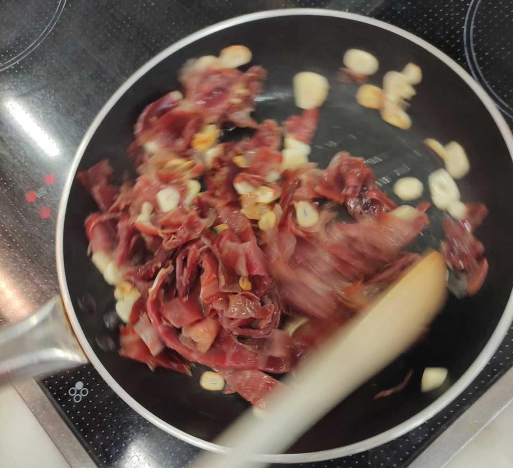 Los ajos se pelan y cortan en rodajas muy finas. El jamón de tiras en trozos.